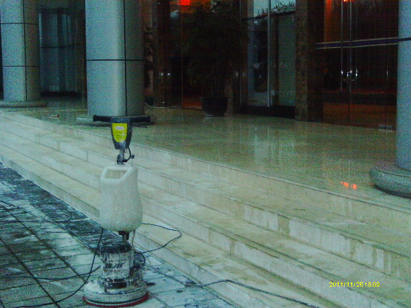 到了70年代末,一種可塑性水溶性結(jié)晶聚合物的誕生,亦即是現(xiàn)今常說的水蠟,進化了石材護理的歷史,可以利用這種物質(zhì)對不同材質(zhì)的大理石進行護理。分底蠟(封蠟),面蠟(拋光蠟)及保養(yǎng)蠟(日常修補蠟)是對大理石的塑層進行保護并利用高速拋光來增亮,對石材的保護起到一定的作用。但是這種水蠟不足之處是蠟層的硬度有限,稍欠保養(yǎng),腳步帶進的塵土將很容易把蠟層及石材磨花。同時,遇上雨水季節(jié),因室外雨水塵埃會有一定的雜質(zhì),通過人的腳步帶進后,對蠟層的分子組成將造成一定的影響。直觀看到是蠟層變黃及缺光澤,也就是以后常見到的許多客戶為什么須經(jīng)常將腐蝕的蠟層用起蠟水脫去,再重新分工序打上底蠟和面蠟,每次的工作量及耗用的物料較大,這種工藝現(xiàn)市場上很普通,我們稱為石材打蠟第二代。